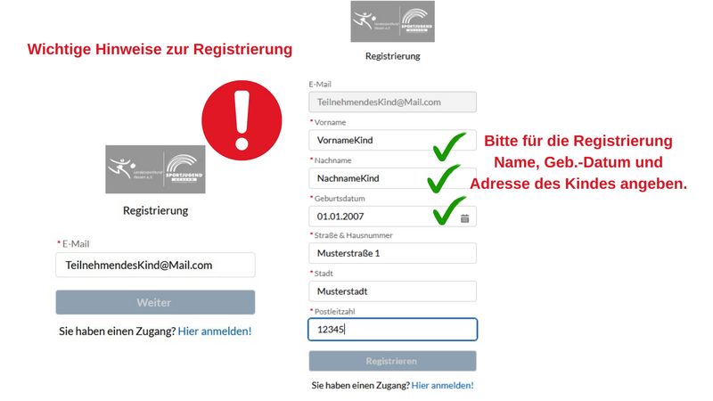 - Bei der Registrierung am Buchungsportal muss Euer Kind als teilnehmende Person mit Namen, Geburtsdatum und Adresse registriert werden!